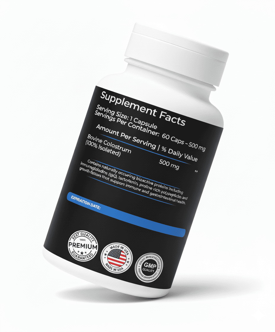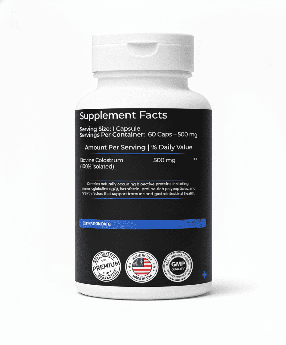 • Amount Per Serving: Bovine Colostrum (100% isolated) — 500 mg